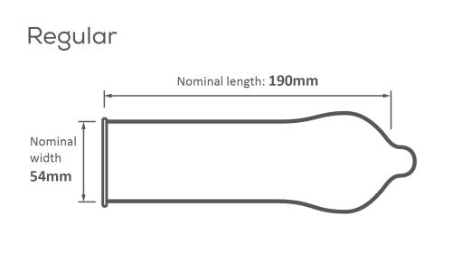The Pasante Rugular is a standard anatomically shaped condom with an average nominal width of 54mm, with a wider top. Because the condom offers more space for the glans, it is comfortable to wear and it gives more feeling during sex.